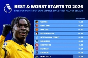 體育資訊3月27日訊 德國(guó)轉(zhuǎn)會(huì)市場(chǎng)統(tǒng)計(jì)了2026年英超球隊(duì)的場(chǎng)均積分,并與球隊(duì)上半賽季的場(chǎng)均積分比較,列出英超球隊(duì)場(chǎng)均積分變化排名,狼隊(duì)+1.01分居首,熱刺-1分墊底。