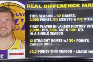 湖人VS奇才,轉播方曬出東契奇賽季數(shù)據(jù):