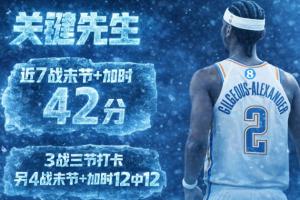 過去7戰(zhàn),亞歷山大3次三節(jié)打卡,其余4場(chǎng)的末節(jié)和加時(shí)合計(jì)12中12,砍下42分。