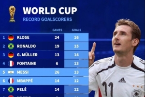 體育資訊4月2日訊 德轉(zhuǎn)列世界杯歷史射手榜,克洛澤、大羅前二,梅西和姆巴佩分居第五位和第六位。