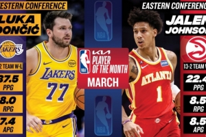 體育資訊4月3日訊 今日NBA官方宣布,湖人球星東契奇和老鷹球星杰倫·約翰遜分別當選三月份西部和東部聯(lián)盟月度最佳球員。