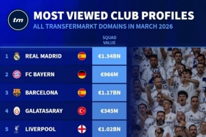 體育資訊4月3日訊 德國轉(zhuǎn)會市場統(tǒng)計了3月份俱樂部頁面的瀏覽量,并列出榜單,皇馬居首,巴薩、拜仁排名二三位。