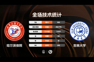 吉林大學(xué):方伯楊20分、羅軼16分、朱凱樂10分、陳前程8分、宋梓滔8分、王嘉威7分6板、劉濱暢5分9板5助