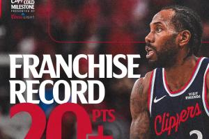 倫納德單賽季連續(xù)45場(chǎng)比賽得分20+,超越鮑勃·麥卡杜(1974-75賽季,連續(xù)44場(chǎng))獨(dú)占快船隊(duì)史第一。