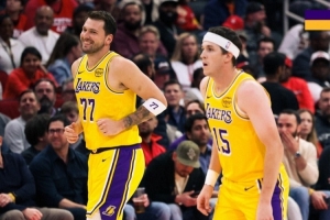 賽后湖人官推發(fā)布贏球海報(bào),封面為東契奇和里夫斯。