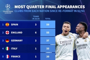 體育資訊3月17日訊 德國轉(zhuǎn)會市場統(tǒng)計了1992-1993賽季歐冠改制以來各國球隊晉級8強的次數(shù),并列出榜單,西班牙59次最多,英格蘭55次第二。