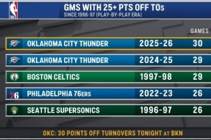 96-97賽季以來單賽季利用對手失誤得到25+紀(jì)錄:
